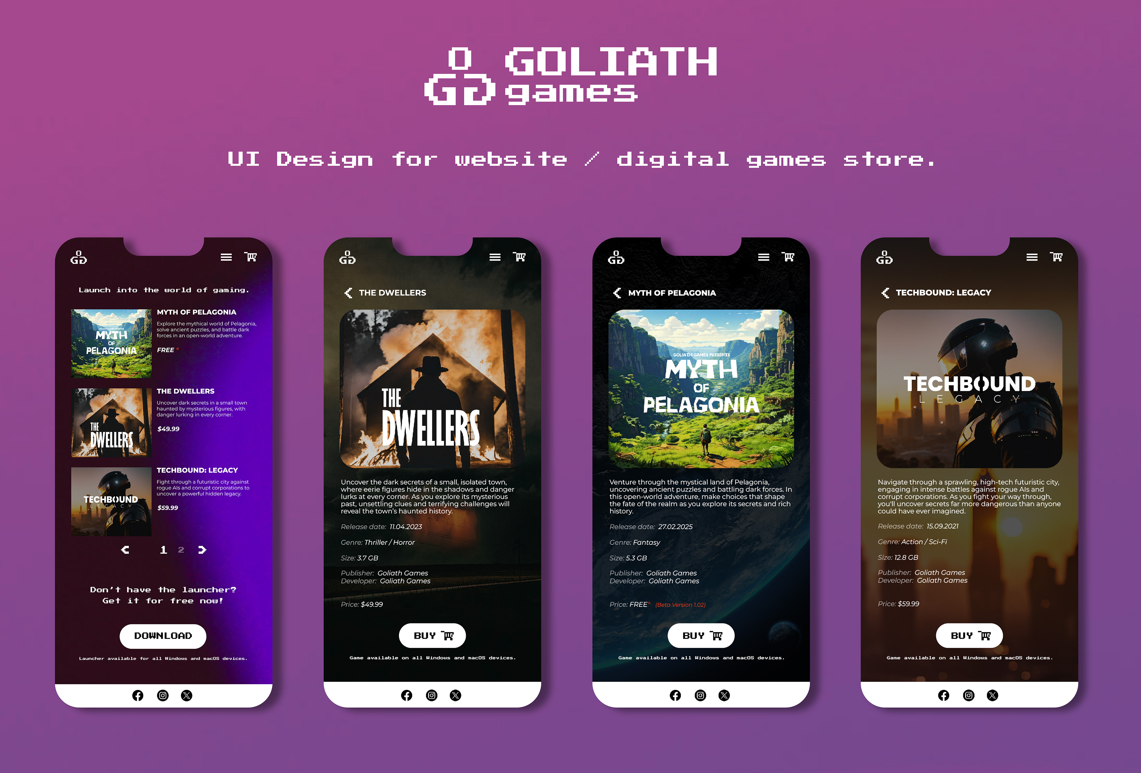 The UX design itself emphasizes clarity, responsiveness, and accessibility, while also putting into focus the unique visual identity of Goliath Games. The UI ensures a seamless and smooth user experience across all Windows and iOS devices.